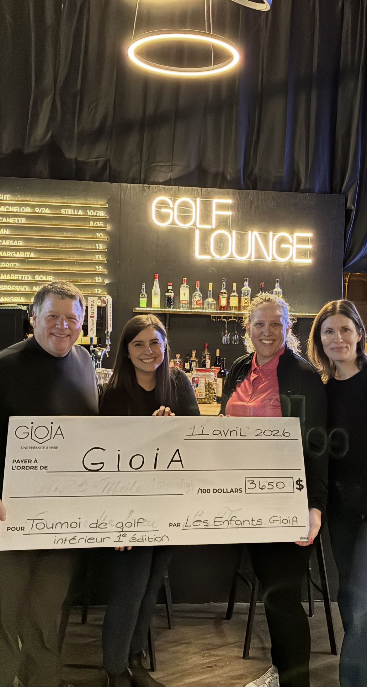 Le samedi 11 avril dernier, 34 participants ont testé leur swing pour une bonne cause. Sur le parcours de golf intérieur du Golf Lounge de Sherbrooke, les golfeurs du samedi et leurs invités ont amassé une cagnotte de 3 650 $ au profit des Enfants Gioia.
